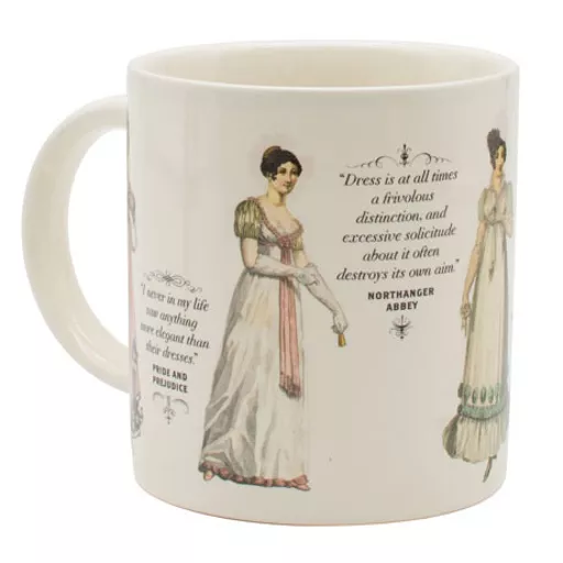 Consider this a formal introduction to Jane Austen's Regency Finery Heat-Transforming Mug. When it is cool, it is ringed with five becoming young ladies, each in her walking attire and bonnet. When it is warm, the young ladies change into lovely evening attire. On behalf of this charming mug in its own gift box, we thank you and send compliments to your mother.